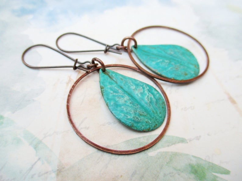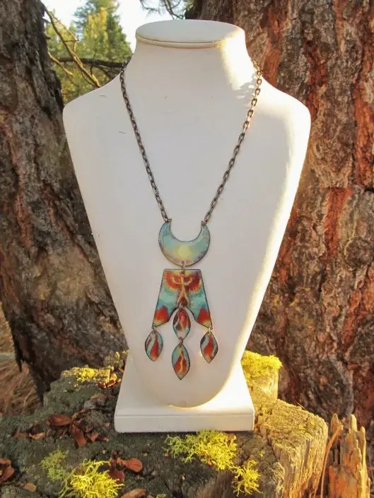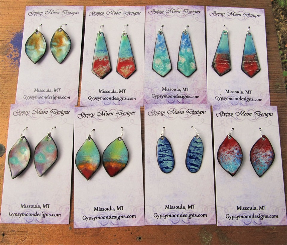 The Copper Enamel Jewelry is hand cut and processed entirely by hand. The colors are layered and painted by torch fire. Some themes include a limited edition line I call Tribal Space earrings that share a collective pattern found in all ethnicities. Other motifs are more natural and universal like our tear drop and leaf earrings.