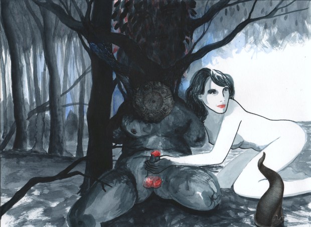 Vous voyez, vous avez bien perçu dans mon travail ceux qui l’accompagnent. Un mot me plaît particulièrement dans vos propos: totémique. Il contient une forme de spiritualité, de brutalité et de mystères antiques. Il me fait penser à la fascination qu’exerce sur moi le mythe de Pasiphae depuis que je l’ai lu, enfant. On y trouve la puissance du désir, le scandale qu’il suscite, comme il renverse le monde. Mes dessins sont des images lentes extraites de toute cette exploration.