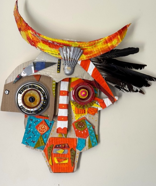 Ancestor, February 2024. Cardboard, feathers and found materials.