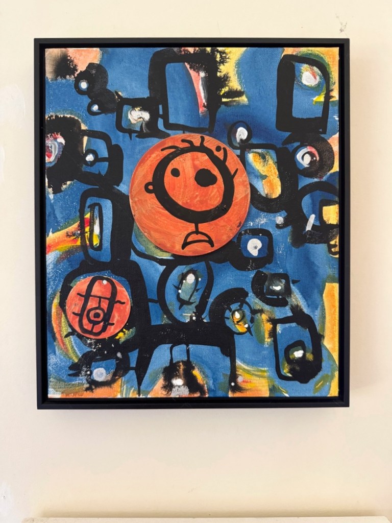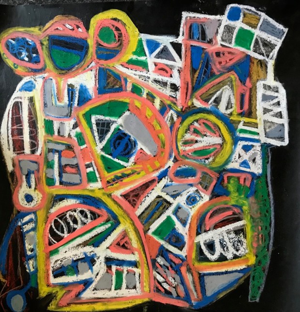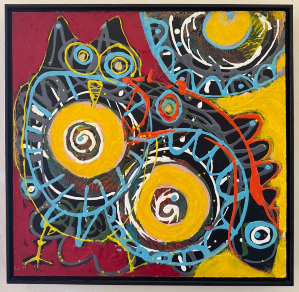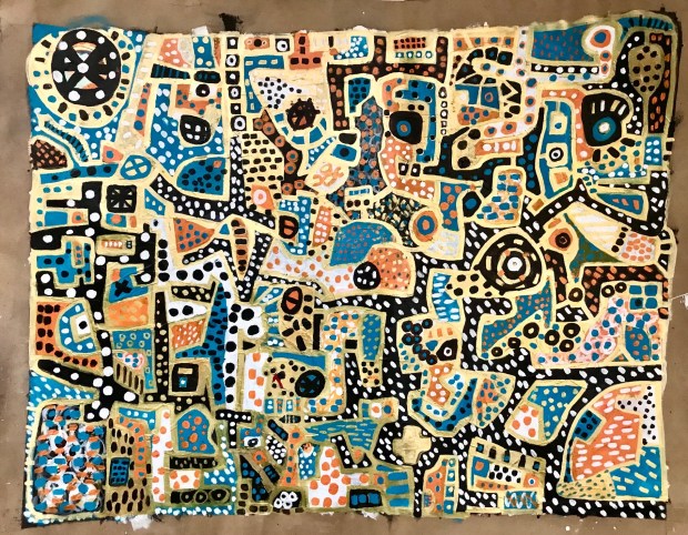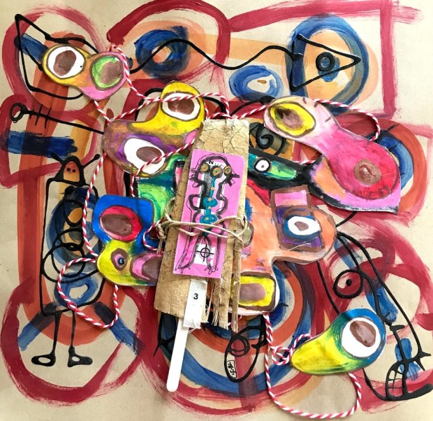 Snakes, ladders and chaos Tim White August 2025. Acrylic paint, oil pastel and paint marker on industrial paper