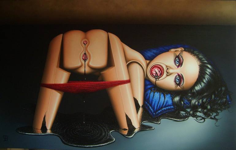 Blac’s work is challenging to look at. It invites the viewer to contemplate and empathize with situations involving sexual violence as a victim. In her own description, she compares rape to a type of murder in which the victim does not lose their life. Blac renders and illustrates emotions in a horrific way. She blends figuration with an eerie, surreal style. In her painting, she frequently uses an effect where the figures appear malleable under the influence of a predatory force. Dolls are frequently used to represent figures. The combination of these elements makes a significant and lingering impression on anyone who sees them. Her paintings hold viewers hostage and give them an intimate feeling of her experience.