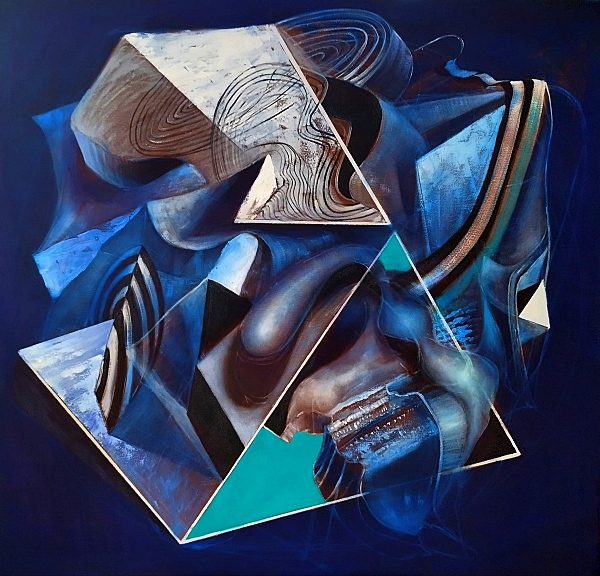 The first lune of this theme depicts me lying on my back on an inflatable lounge and looking up at the shining azure sky. I could see nothing but blueness, and this mirrored how the utter calmness of the soothing water had emptied my mind. Any thoughts were now “see-through,” i.e., I was cognizant of them but somehow distant from them. A profound restfulness and tranquility overcame me; meditation without trying (one other version). The second and third poem describe a spatial encapsulation of the totality of all existence. The pool is an earthly, this-world microcosm of the sky, which is the boundless empyreal macrocosm. Somewhere between “the above” and “the below” is the individual soul, an imperfect reflection of allness that futilely attempts to capture and control ultimate reality.