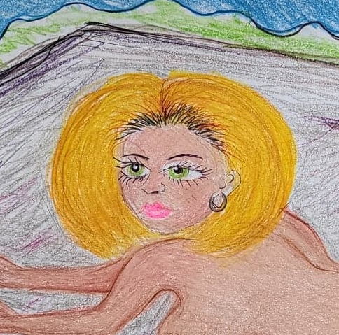 Crisp yellow and gold designer bikinis, light summer dresses, brassieres. And panties are strewn across towels covered with tubes of sun screen, Purses, car keys, fruit, sandwiches cold drinks, a paperback of classic 19th century literature and a current glossy fashion magazine glistening in the sun.