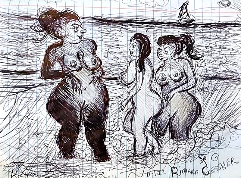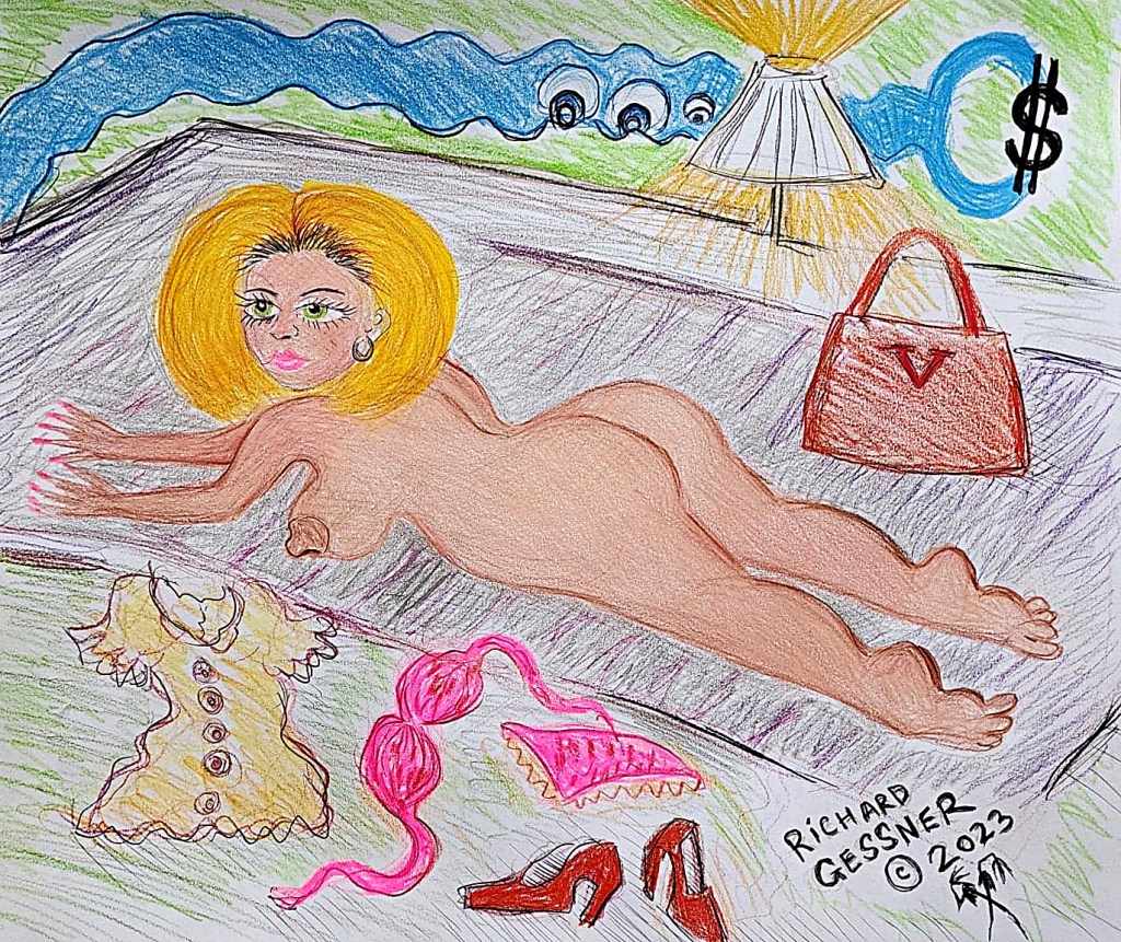When I read Richard Gessner’s Voyeur Rising I imagined the story as an adult cartoon with liminal existential qualities. Voyeur Rising reminds me of Vladimir Nabokov’s use of an unreliable narrator who is found in most current social media video and reels. This collective trick usually deceives the viewer with a decoy. This is the place where Gessner’s work lurks, to induce the peripheral mind while feeding the predatory eye. Here we see the ultimate conflict and fantasy of the Freudian id haunting the masculine mind. A pleasure principle with an intrusive desire to poach voluptuous women without any commitment- but to squirt sperm, to clone more succulent women so they are everywhere. The fantasy has boundaries in Gessner’s character who is aware of his masculine delusion, that every women he find’s attractive isn’t a possession but an unfulfilled wish. All this takes place by the primordial ocean, a surface alive with waves.