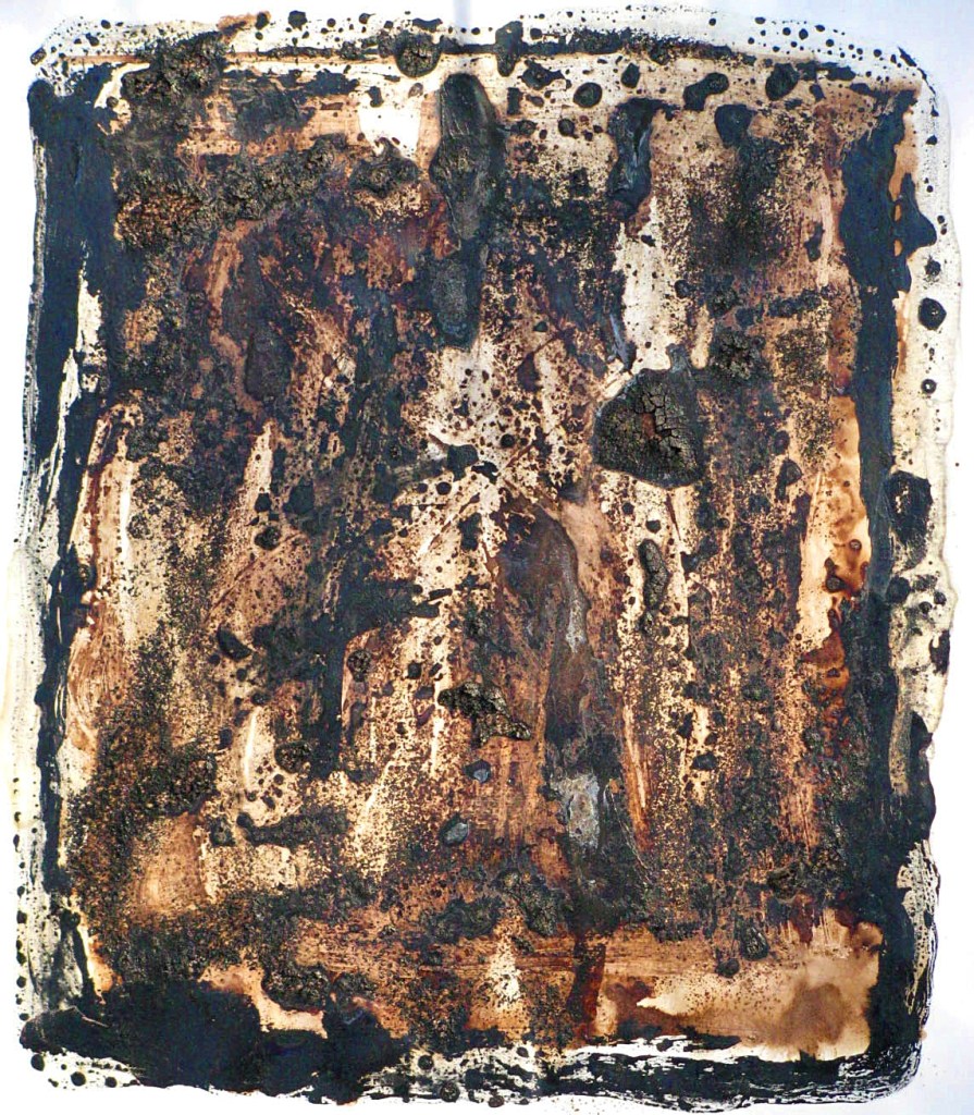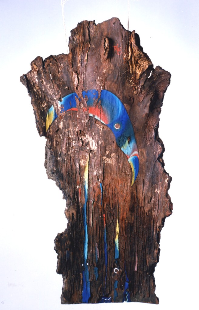 BEING AN ADULT, HOW COMPLICATED…. EVERYTHING WRITTEN IS BORN FROM ONE OF THE PICTURES OR “ FRAGMENTS”, WHICH I PAINTED YEARS AGO ON A TREE BARK (ABOVE IN THE PHOTO) AND WHERE THE SPIRIT OF HAIN MANIFESTS HOUSING IN THE PAINTED FIGURE OF AKLOKÉTEN . HERE IS REPRESENTED THE COMPLEX SYMBOLISM OF INITIAL OPPOSITION AND TRANSFORMATION BY WHICH THE KLOKÉTENHE WAS SUBJECTED INSIDE SECRET SOCIETIES THAT SEEKED TO TURN HIM INTO A MAN. THE FUSION OF A WORLD IN TRANSIT OR RITE OF PASSAGE IS INCORPORATED INTO THE PICTORICAL SIGN AND INTO THE HISTORY BROUGHT WITH IT BY THE SUPPORT, COLLECTED FOR THAT PURPOSE ON THE SLOPE OF THE VILLARRICA VOLCANO FROM THE CALCINATED REMAINS OF A CONIFER SPLIT BY LIGHTNING. JUST AS THE ANCIENTS DID TO MAKE THE RITUAL MASKS WHICH THEY USED IN THEIR CEREMONIES, I COLLECT THE BARK OF THE TREES TO PAINT THEM WITH PART OF THIS HISTORY THAT DISAPPEARS AND THAT ALSO BELONGS TO ME, BEING THE COLLECTION, A RITE THAT IS SIBLISHED TO THE PAINTING ALREADY THE TELLURIC TEXTURES OF THE EARTH, LIKE BROKEN FRAGMENTS FROM A NOT SO REMOTE PAST, AND IN WHICH WE STILL REFLECT OURSELVES.