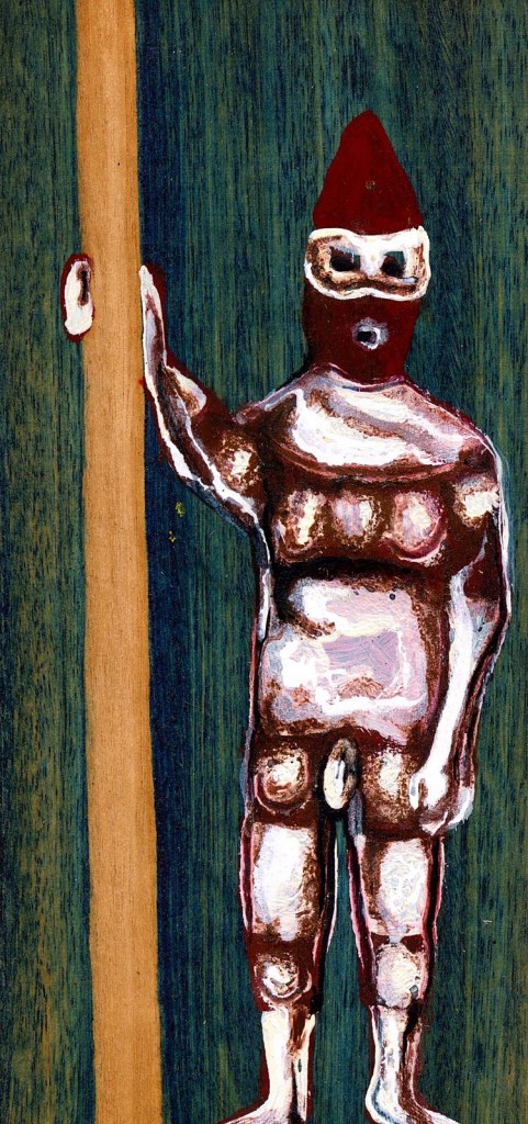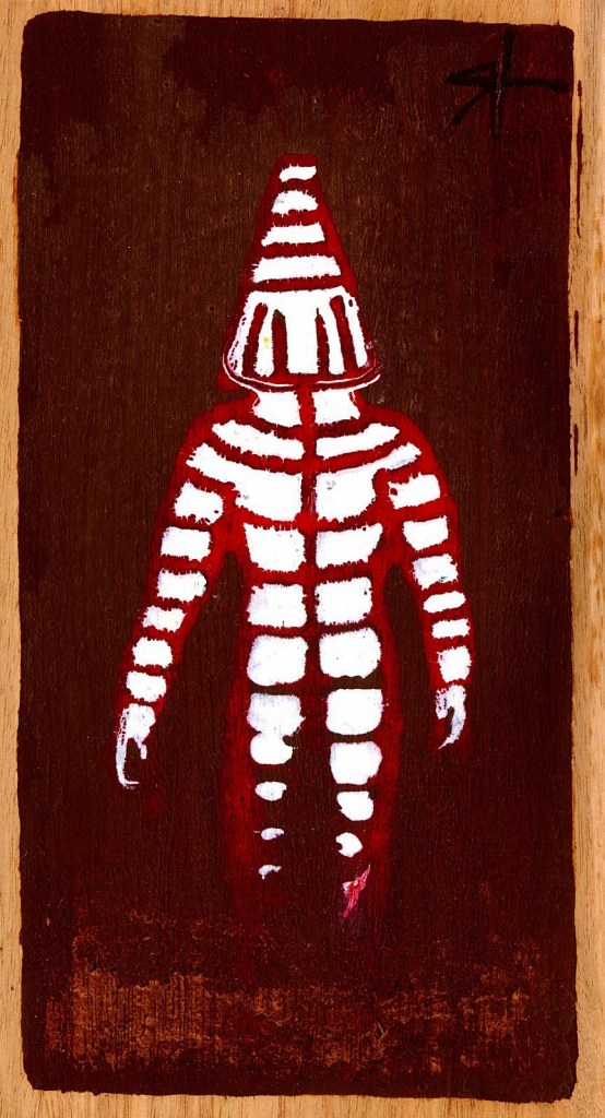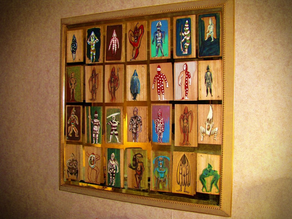 ACID LIKE A PAINTING COMPOSED OF SEVERAL PIECES THAT TOGETHER MAKE UP A MAJOR WORK, “MY LITTLE SELK’NAM ARMY” IS A POLYPTIC MURAL OF FIGURES IN OIL AND MIXED TECHNIQUES ON COIGUE AND MAÑÍO PLATES THAT I BEGAN TO PAINT IN 1998 AND WHICH I CONTINUE TO PAINTING UNTIL TODAY AS AN EXERCISE OF CREATION ON TRAVEL, CARRIED OUT DURING MY TEMPORARY TRANSIT THROUGH DIFFERENT PLACES IN CHILE SUCH AS THE ANDES MOUNTAINS, THE SOUTHERN CANALS, PATAGONIA OR THE ROUGH ARIDITY OF THE NORTHERN COASTS, TRAVELING ON SOLO EXPEDITIONS OVER THE DECK OF BOATS, BUS SEATS, LOANED CARS, MICROS OR PLANES; RESTING IN HOTELS, SHELTERS OR TENTS, WORKING AND WALKING IN WHICH ARE UP TO NOW 120 FIGURES OF BODY PAINTED IN A SIZE OF 16 X 10 CMS EACH AND WHICH FORM AS A WHOLE,