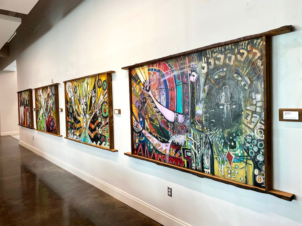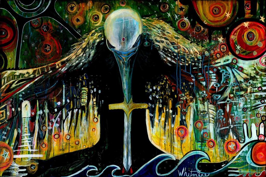 Some parts gets covered up and pushed back and others change and are pulled forward. The pieces tell their own narrative as they become deeper with layers and more defined. I work on large 6 foot x 4 foot pieces of birch and frequently layer with colored pencil, watercolors, oil pastels, pouring paint, acrylic ink, China marker and more.