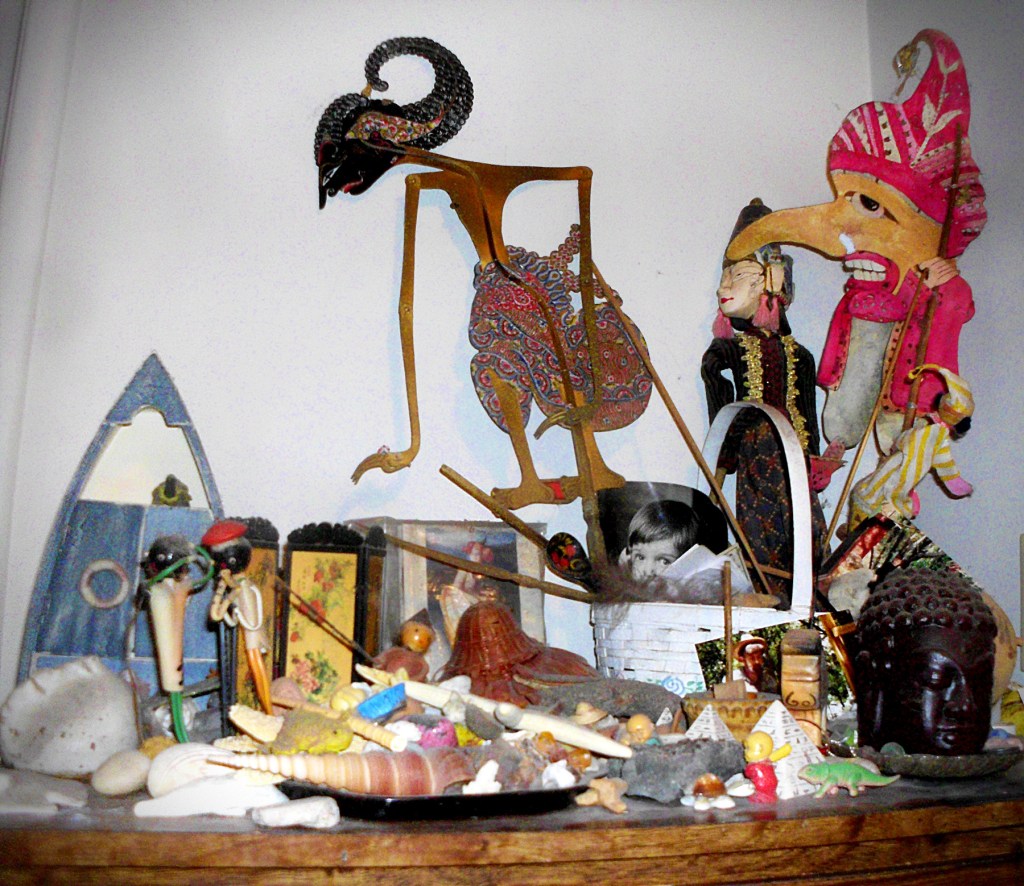 This is the biggest shrine in the house, and in the main living space, so probably the best organised. A mix of heirloom items, curios and pop culture junk. Framed artwork on the wall is by (l to r) Janice Hathaway, Tim White and Peter Overton. The boxed object at upper left is a magic bottle that belonged to my grandfather, an amateur conjurer.