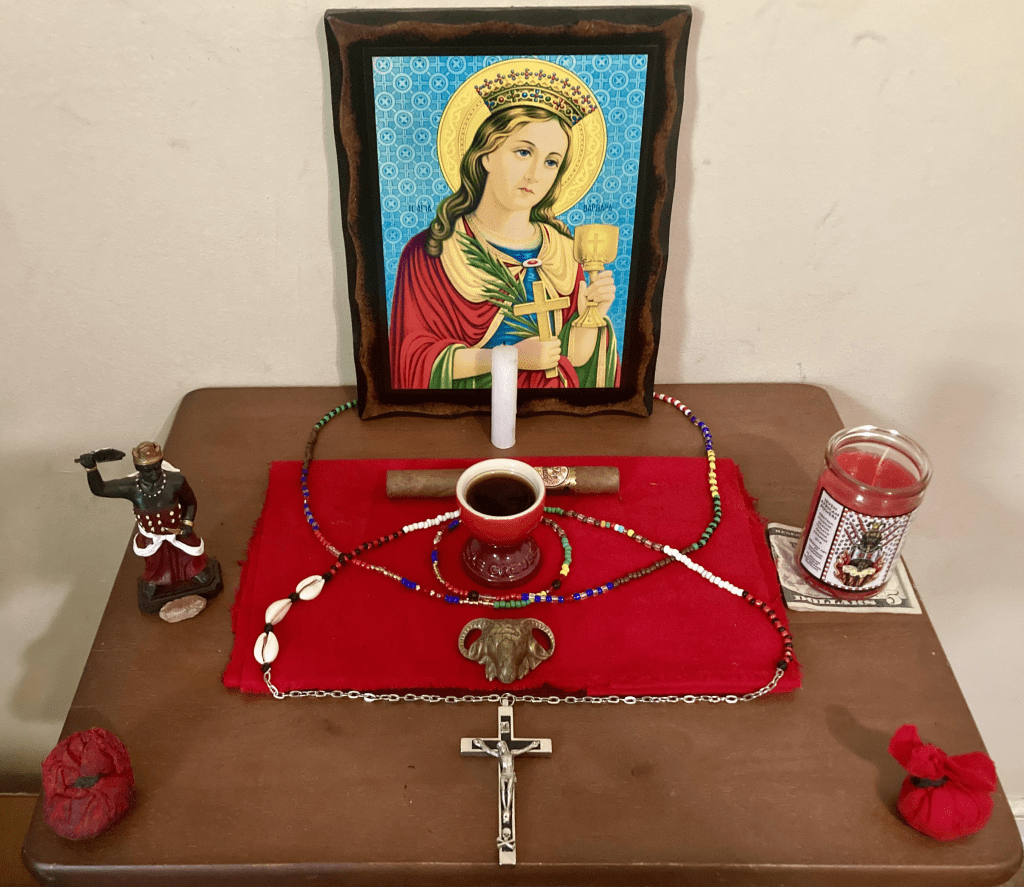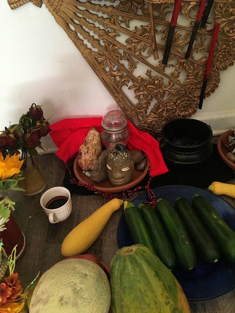 During the pandemic complimentary rum and coffee were supplied as part of a thoughtful routine and ritual. The other side of our altar is a shelf for salts, herbs and spices.