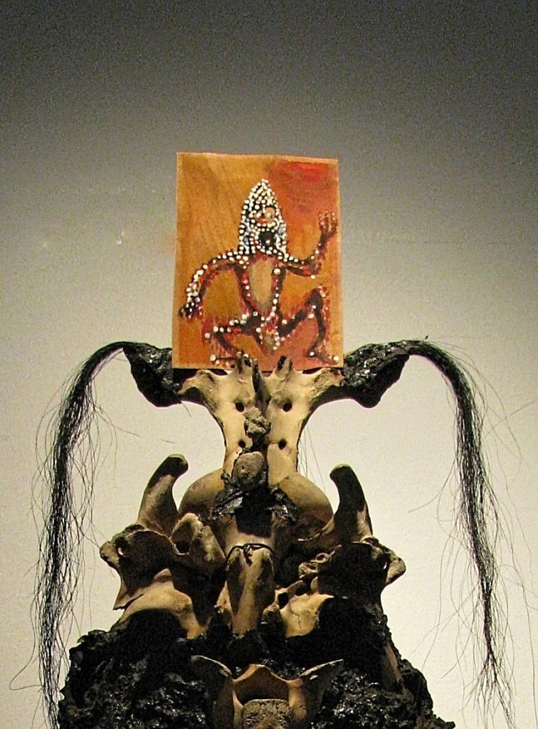 BEING AN ADULT, HOW COMPLICATED…. EVERYTHING WRITTEN IS BORN FROM ONE OF THE PICTURES OR “ FRAGMENTS”, WHICH I PAINTED YEARS AGO ON A TREE BARK (ABOVE IN THE PHOTO) AND WHERE THE SPIRIT OF HAIN MANIFESTS HOUSING IN THE PAINTED FIGURE OF AKLOKÉTEN . HERE IS REPRESENTED THE COMPLEX SYMBOLISM OF INITIAL OPPOSITION AND TRANSFORMATION BY WHICH THE KLOKÉTENHE WAS SUBJECTED INSIDE SECRET SOCIETIES THAT SEEKED TO TURN HIM INTO A MAN. THE FUSION OF A WORLD IN TRANSIT OR RITE OF PASSAGE IS INCORPORATED INTO THE PICTORICAL SIGN AND INTO THE HISTORY BROUGHT WITH IT BY THE SUPPORT, COLLECTED FOR THAT PURPOSE ON THE SLOPE OF THE VILLARRICA VOLCANO FROM THE CALCINATED REMAINS OF A CONIFER SPLIT BY LIGHTNING. JUST AS THE ANCIENTS DID TO MAKE THE RITUAL MASKS WHICH THEY USED IN THEIR CEREMONIES, I COLLECT THE BARK OF THE TREES TO PAINT THEM WITH PART OF THIS HISTORY THAT DISAPPEARS AND THAT ALSO BELONGS TO ME, BEING THE COLLECTION, A RITE THAT IS SIBLISHED TO THE PAINTING ALREADY THE TELLURIC TEXTURES OF THE EARTH, LIKE BROKEN FRAGMENTS FROM A NOT SO REMOTE PAST, AND IN WHICH WE STILL REFLECT OURSELVES.
