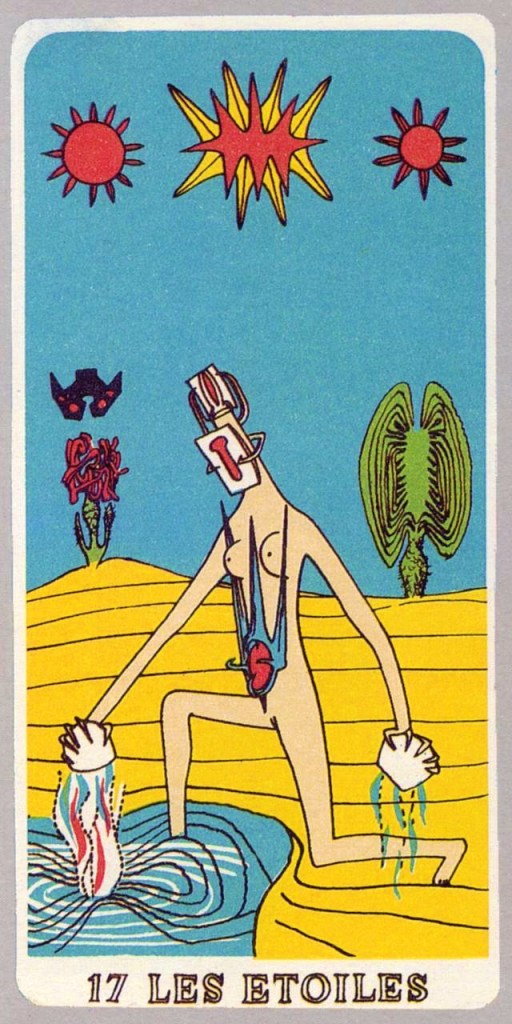 This is another example of the surrealist passion for tarot. The title of Breton’s long prose poem, Arcane 17, refers to tarot card 17, the “stars” card (Les étoiles), usually a symbol of free-flowing love and renewal of forces. However, Breton’s imagination brought new associations, multiplying the morning stars and infusing them with fluid meanings. Breton describes the figure in the center of the card as a naked young woman kneeling as she pours out the contents of two urns, one into a pond, the other onto the ground. He associates this woman with the legendary figure of Mélusine, a legendary mermaid who became a symbol of the difficulty to reconcile “reality” and “magic.” There is hope, however, that the “inexhaustible” urns could renew our disenchanted world. Indeed, even though the pond gives off the “pestilential odor” of social conventions, it is still longing for “a new dream.” The fragile butterfly is another symbol of “consoling mystery.” Chilean painter Roberto Matta designed the four colorful illustrations in the shape and size of tarot cards (or “arcanas”) pasted in the book.