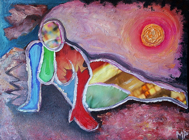 Featured picture Entanglement in a sombrero galaxy, a hummingbird ankoku butoh 9inx10-1/2in oil, collage on sandpaper 2022 Mitchell Pluto