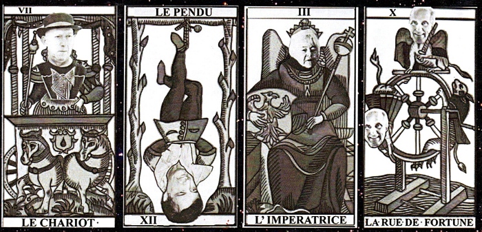 A harmony founded on the spiritual in all its forms, love of humanity in all its beauty, we can thus clearly see the richness of the esoteric domain approached this way by the surrealists, who incidentally made the Star, in the Deck of Marseille, the symbol for the suit of Dreams, whose face cards are Lautréamont, Alice in Wonderland, and Freud. This deck was conceived (these things are never invented) between the Villa Air Bel and the café Au Brûleur de Loups.
