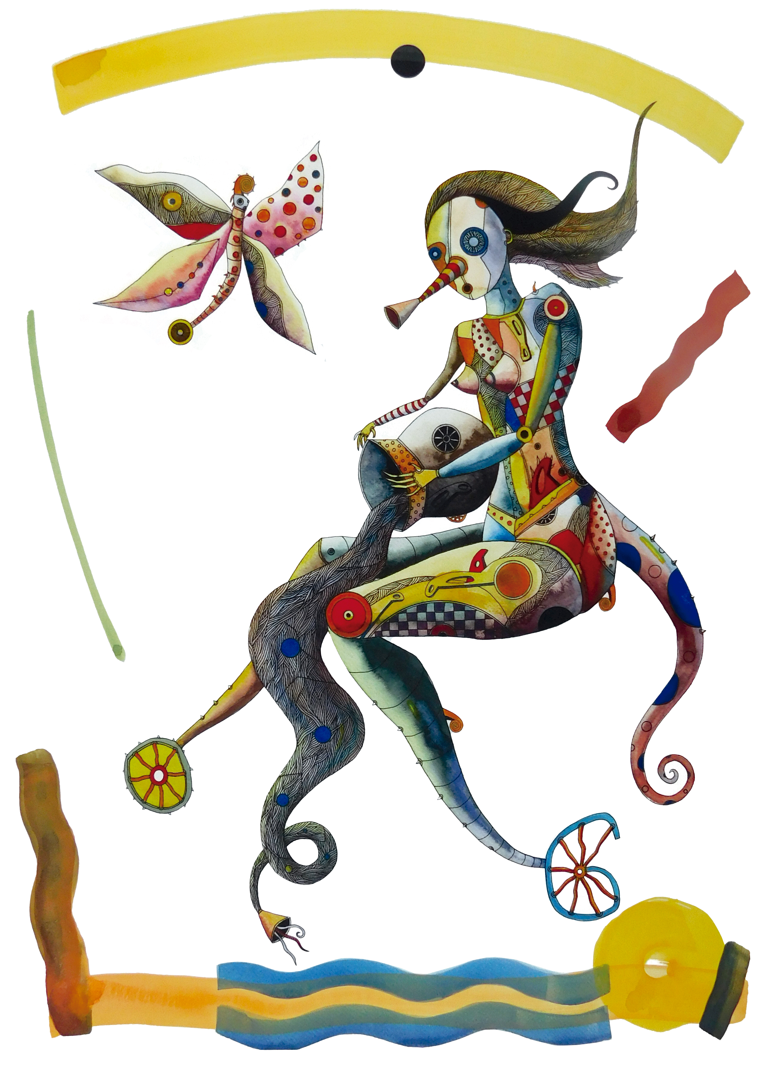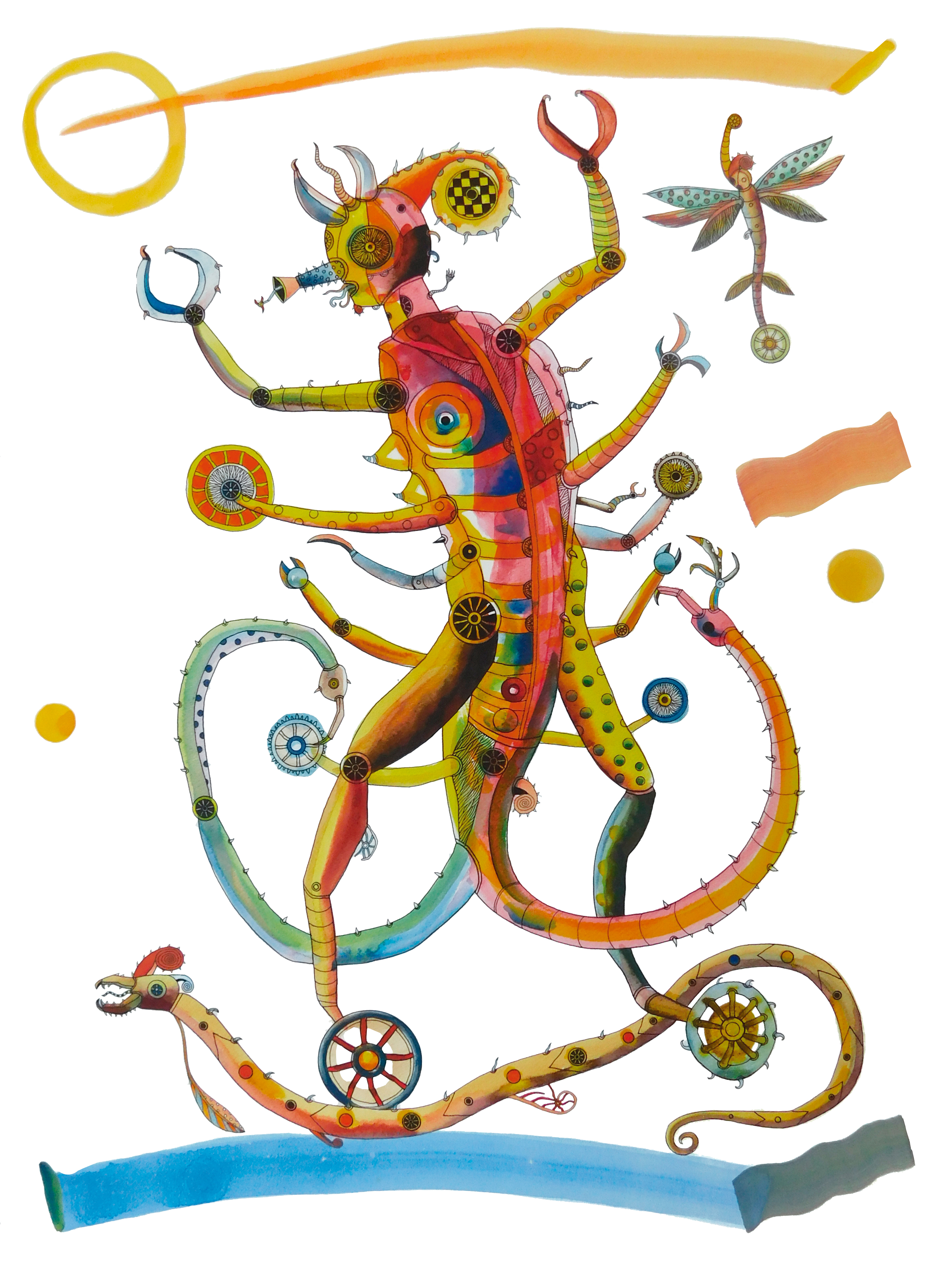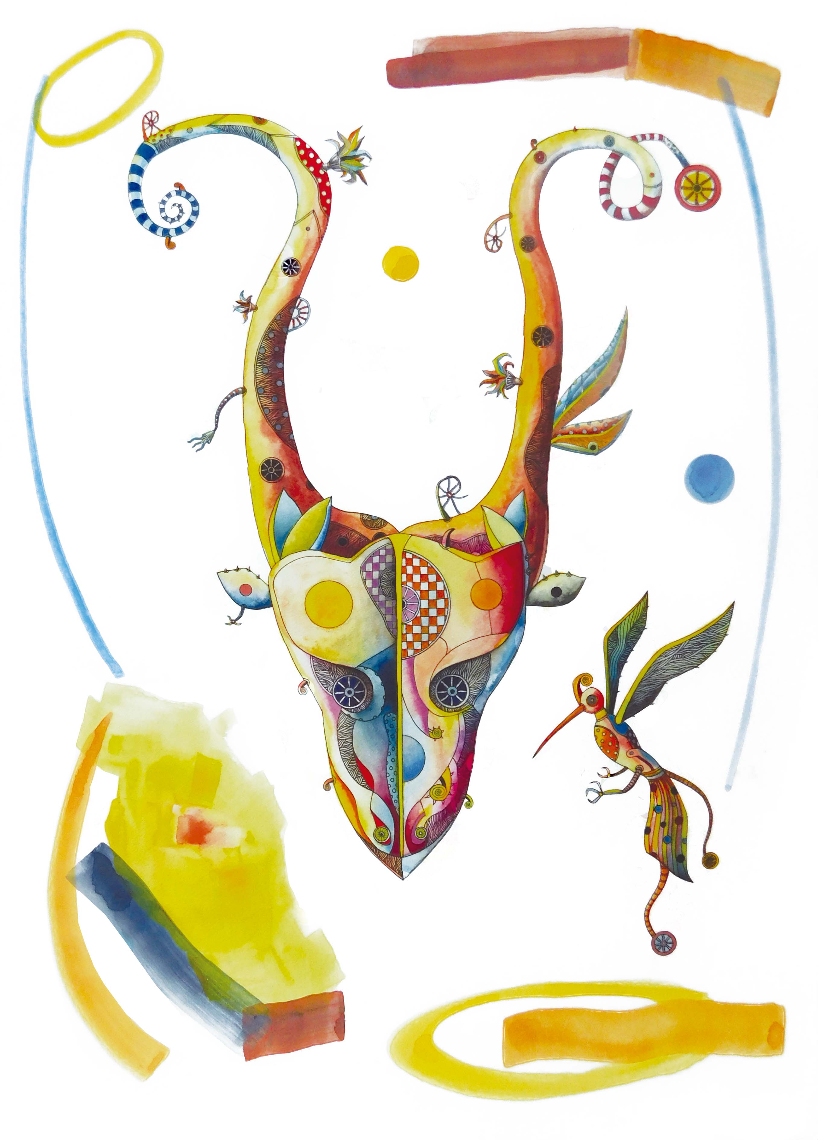 Handmade Paper, feather, gold leaf, dyes, ink, acrylic pens.