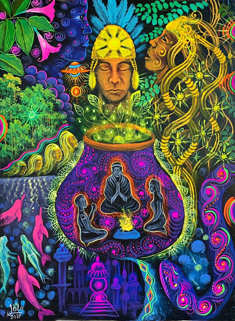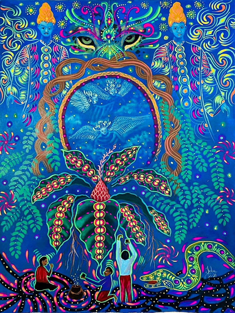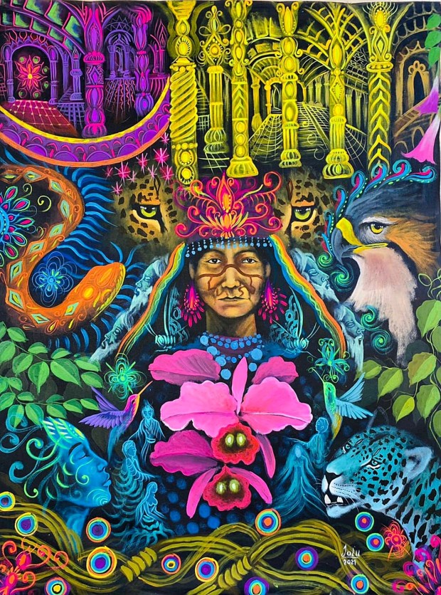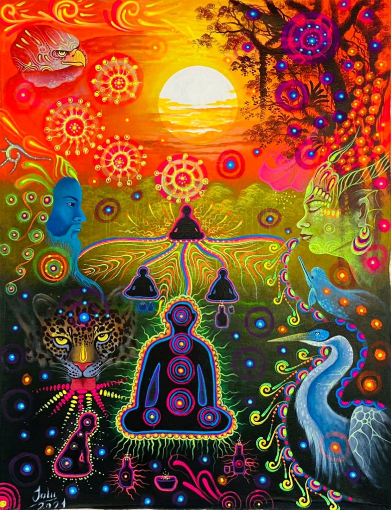 I am Jose Luis Vasquez Gonzales, known as JoLu Amaringo, I was born in the cradle of art on December 5, 1991, in the city of Pucallpa_ Peru, when my famous grandfather, the Peruvian painter International Amazonian Visionary Pablo Amaringo Shuña, flew to Japan to present one of his famous exhibitions on visionary and neo-Amazon art. During my life in my grandfather Pablo Amaringo’s house with my father Juan Vasquez Amaringo and my mother Lidia Gonzales Laulate, I drank countless stories that I heard in frequent meetings around a table. I also drank the vocation for the art of painting.