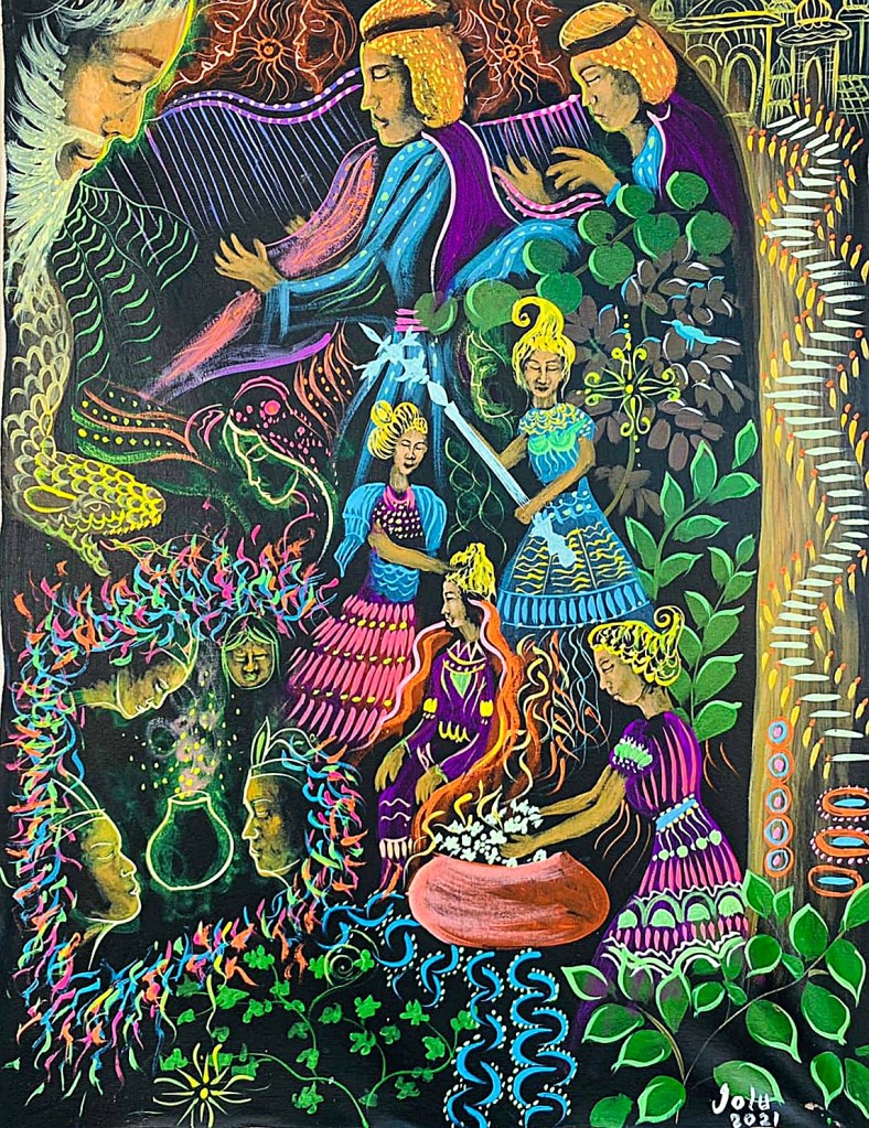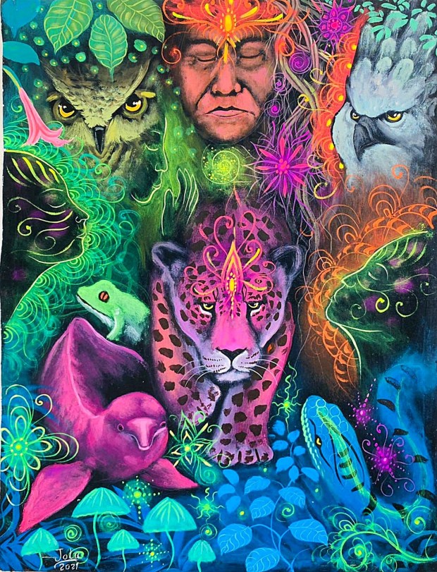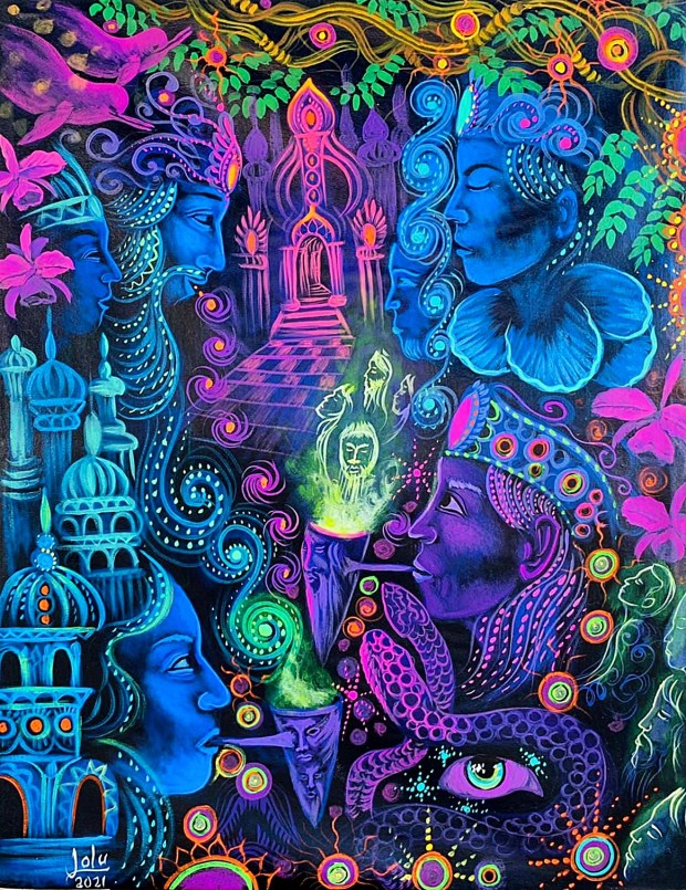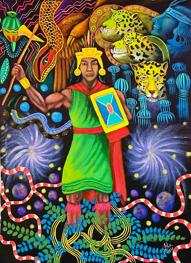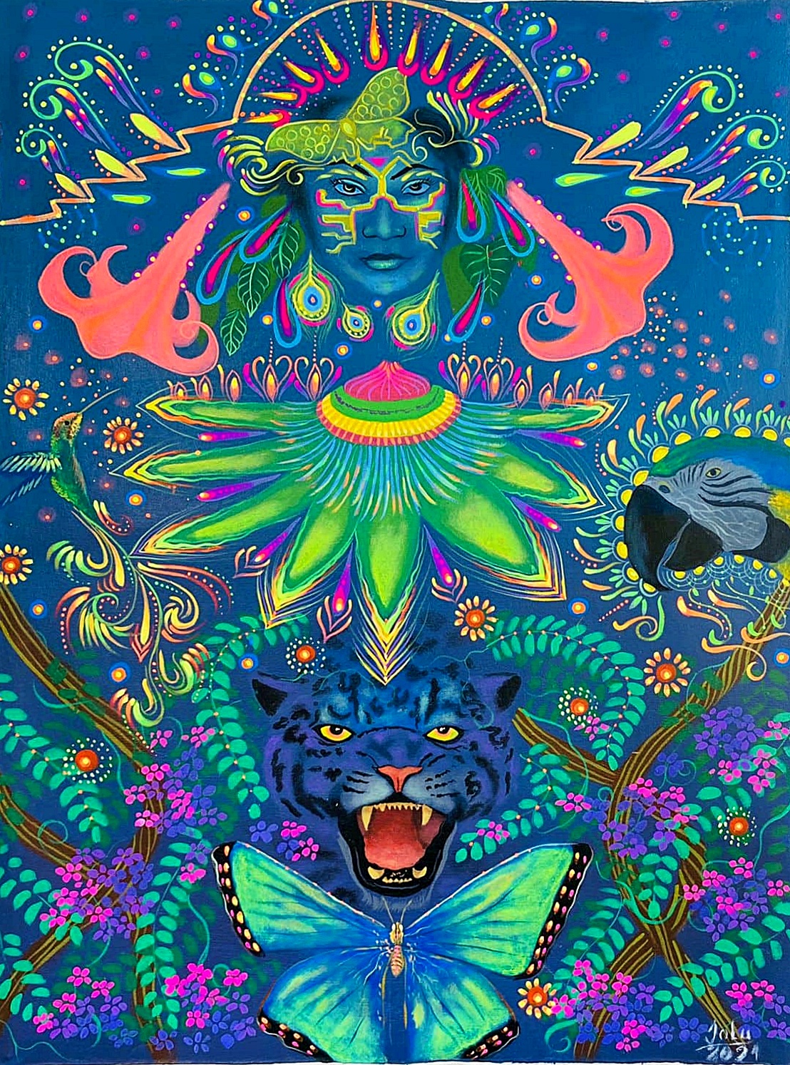 I am Jose Luis Vasquez Gonzales, known as JoLu Amaringo, I was born in the cradle of art on December 5, 1991, in the city of Pucallpa_ Peru, when my famous grandfather, the Peruvian painter International Amazonian Visionary Pablo Amaringo Shuña, flew to Japan to present one of his famous exhibitions on visionary and neo-Amazon art. During my life in my grandfather Pablo Amaringo’s house with my father Juan Vasquez Amaringo and my mother Lidia Gonzales Laulate, I drank countless stories that I heard in frequent meetings around a table. I also drank the vocation for the art of painting.