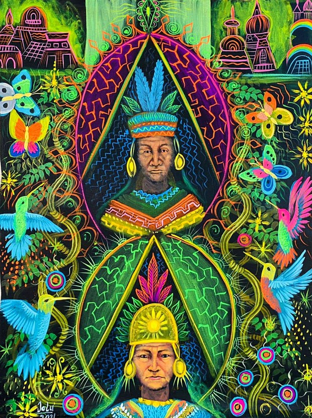 In this visionary work of art we see two Inca spiritual teachers. These Inca masters are powerful Sumirunas and Paleros. Their crown, decorated with red and green plants, gives them protection when they drink ayahuasca. His apprentices of palistic alchemy who specialize in sticks can master them only after several years of strict diet aided by these dryads. The radiating waves of colors illustrate the healing energy of the fiber, which aids the shaman. The hummingbirds and butterflies that we see in this visionary work are messengers that warn the Sumiruna Inca masters of dangers. Its sweet trills are the most delicate and sublime icaros to sing to people seeking new strength or suffering from terrible illnesses. These celestial spirits dwell in the palaces and temples above, where they gather to sing songs of worship.