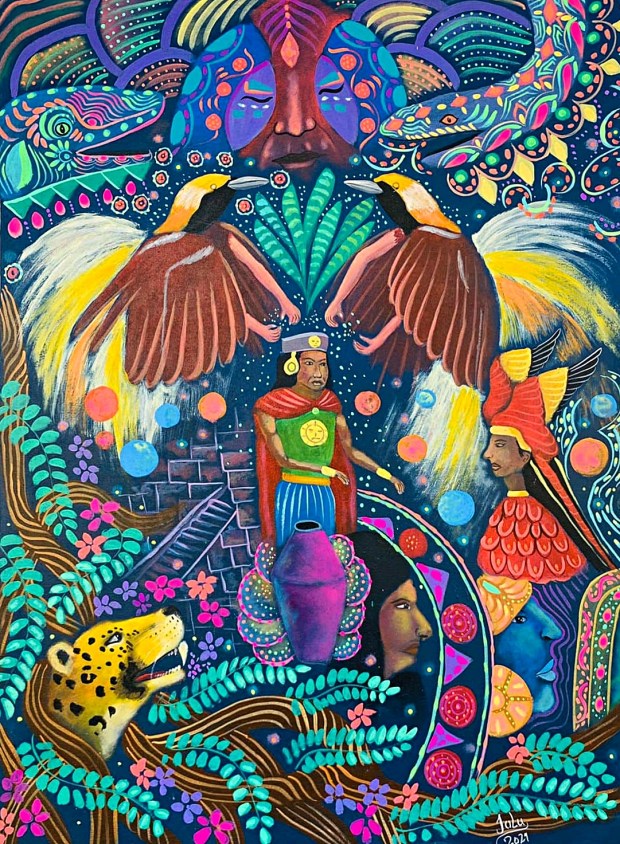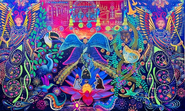 In this visionary work of art, the profound revelation that ayahuasca gives to heal the damage caused by sorcerers and witches is shown. The golden spiral that we see in this visionary work symbolizes the eternal movement of spirit and matter within solar systems and galaxies. Just to the left is a sumiruna level master who is icarando (singing magical songs) to heal his patient from harm. To the extreme right and left we can see three faces of women with crowns of different colors, these crowns show the level of knowledge that each one has. They also represent the nurturing love of Mother Earth, and a mother’s love for her children. The fuchsia palace in the lower right is where the shamans learn to heal. Ayahuasca reveals its deepest secrets when visionary dizziness is at its strongest. Here he shows that human beings need to create a balance between their good and bad sides. The steps lead to the underwater kingdom where mermaids, sirens, pucabufeos and the yacuruna reside. In the lower central part of the work is the huarmi muraya, which is like a mermaid, dressed in the scale armor of the celestial fish that teaches the shamans the art of alchemical healing. Birds are messengers from heavenly temples and palaces. The macaw, the green and purple hummingbirds, the eagle. All these birds have a lot of esoteric wisdom; they warn of danger, reveal secrets and teach the sublime wisdom of love.