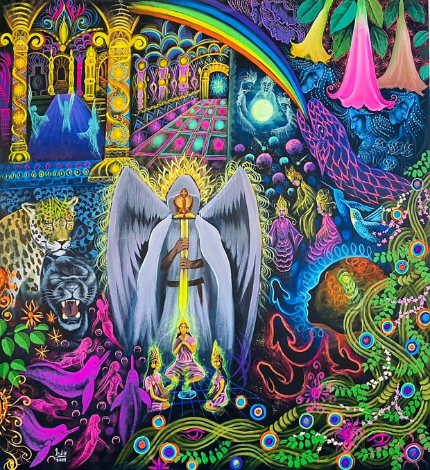 In this visionary work of art we can see on the far right the ayahuasca vine and on the far left the chacruna plant, these are boiled together to make the mystical ayahuasca brew. The angels that we see in the central part of the work transmit spiritual energy to the plants so that the shaman masters can see the angelic powers in action in their visions. The colors of the angels have a meaning: green represents the beginning of life, blue represents enthusiasm and energetic strength, and the yellow of the east represents the freshness and joy of the morning, the fuchsia color represents the satisfaction of a productive day. At both lower ends we see two female Shipibo shaman teachers. They have the degree of sumirunas, and they know the icaros to heal all kinds of damage according to the colors that the angels have and were taught, for example the green color to heal a patient who suffers mortal damage. After healing, the blue icaro is sung to gain strength, the fuchsia icaro prevents boredom and inactivity, and the yellow icaro will make a person happy. In the upper central part of the work, we see an alien spaceship that visits Earth frequently. They come from parallel universes and are approached by the Sumirunas to understand the mysterious forces of electromagnetism and gravity that sustain the cosmos.