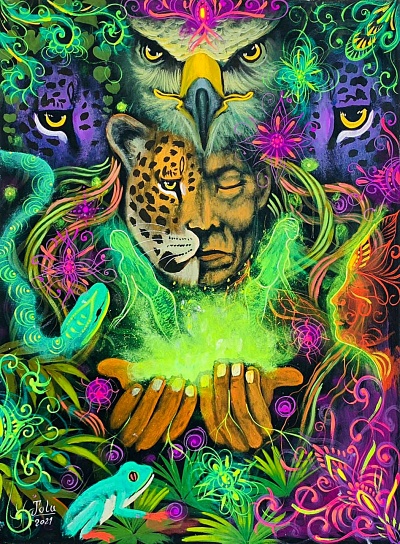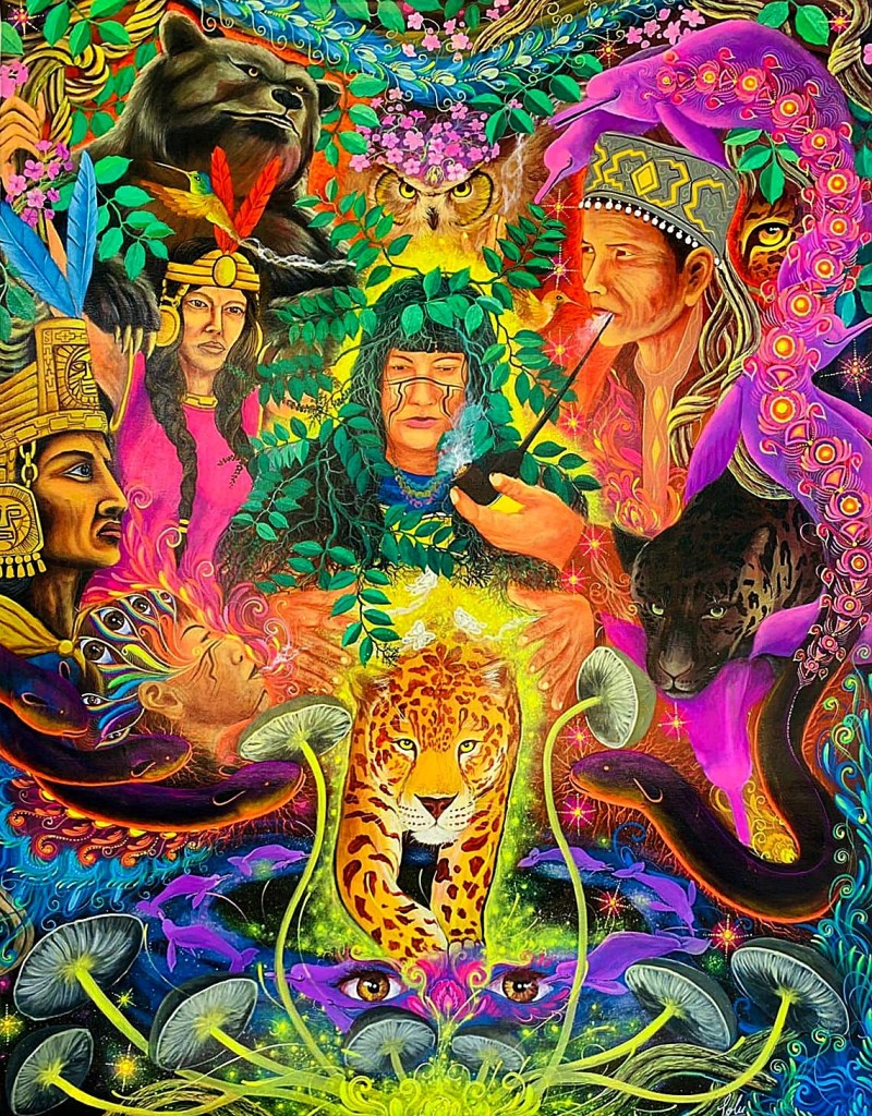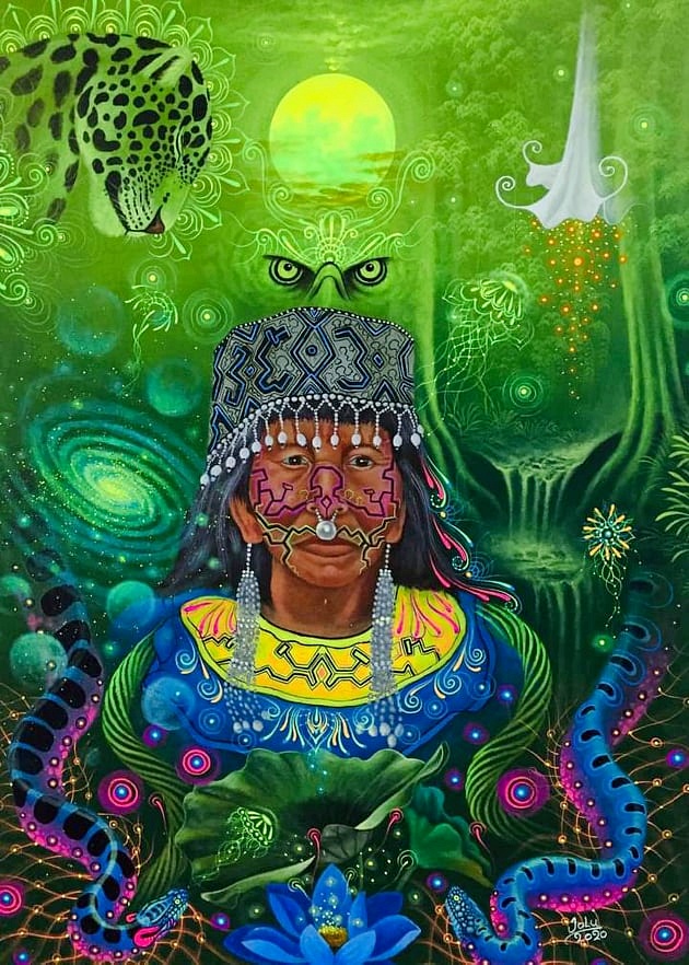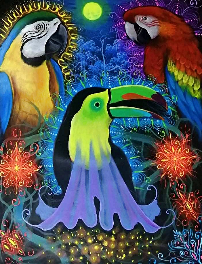 At 6 years of age, I began to transfer my inspiration and imagination to paper using tempera paint, with the guidance and teaching of my grandfather Pablo Amaringo, over the years I learned to use the technique of acrylic painting on canvas. Today I paint in acrylic and oil, the visions of ayahuasca and neo Amazonico styles, all thanks to my dear grandfather Pablo Amaringo Shuña.