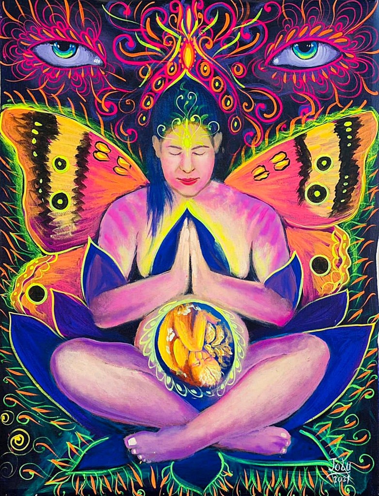 This painting explores the mystical beginning of life, which can be accessed by drinking ayahuasca. The eyes that we see at the top are from the Supreme Being, they emit dynamic energy that surrounds the pregnant woman. The dynamic energy that is surrounding the pregnant woman is the spark of life and the origins of the blood are entering the pregnant mother like waves while she sleeps. They penetrate the womb, giving the child emotions and characteristics, just as electromagnetic waves produce an image on a television screen. It is what you are given to deal with all the problems of life. The yellow energy that surrounds the fetus, are the first particles of matter that were formed by tingunas (electromagnetic patterns). Butterfly wings refer us to the spiritual world, to the imagination, to intelligence, the possibility of movement and, therefore, the capacity for spiritual and physical advancement. Butterflies have represented the unconscious attraction to light, beauty, what is most characteristic of life and the soul. Finally we see the pregnant woman, who is sitting on the lotus flower and is related to the perfection of the spirit and mind, a state of total purity and immaculate nature. She is represented by 10 petals that reveal the innocence and original nature of the heart. This flower also represents qualities that are transmitted to the child from her womb such as love, passion and compassion.