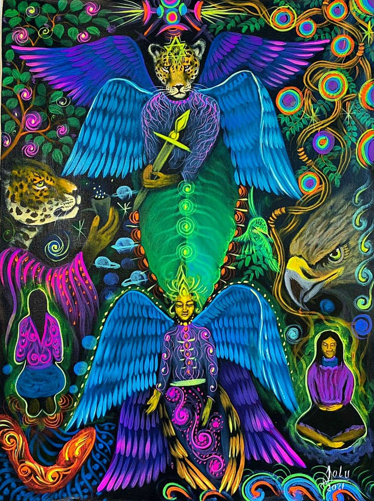 In this visionary work, we see a jungle woman (Sacha Huarmi), she is a master shaman of the Muray level, she can enter the tree or the waters and dive into the depths of the earth, but she does not have the ability to go to the space. Below her we see that the winged elemental spirits are arriving, these are napeae and camenae singing and orchestrating the mystical framework of the ceremony. These spirits bring perfumes and balms to prepare and protect Master Muraya. The jaguar that we see on her, emits arkanas with the colors of the rainbow that surround the teacher Muraya and deflect any sorcery. The shaman teacher is also learning from the jaguar that we see to the right of her, how to hypnotize the enemies that want to attack her. At the top of the work we can see the golden temple of ayahuasca, in this temple they teach about the upbringing and care of children. In the temple they teach you to nurture your home and your family, you learn to take care of the structure of your home. In the purple temple called the palace of the punga is where the shamans are taught the mysteries of the mariri and the breath. The helical shape of the ayahuasca vine indicates that it can reveal the DNA of living beings and embody their vibrations and icaros. The DNA of animals and plants have much in common with ours; this makes it possible for us to empathize with a tree or an animal.