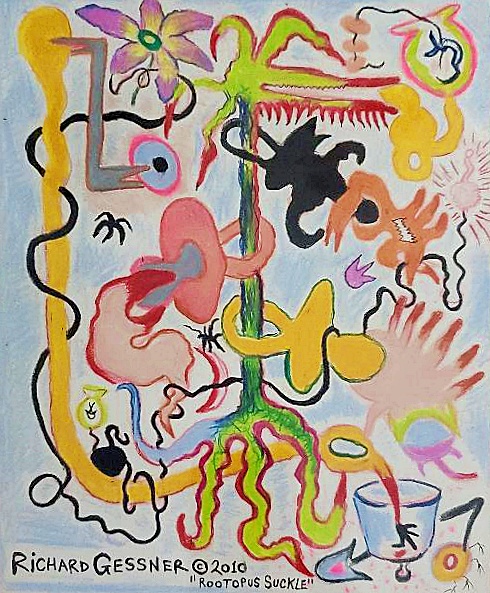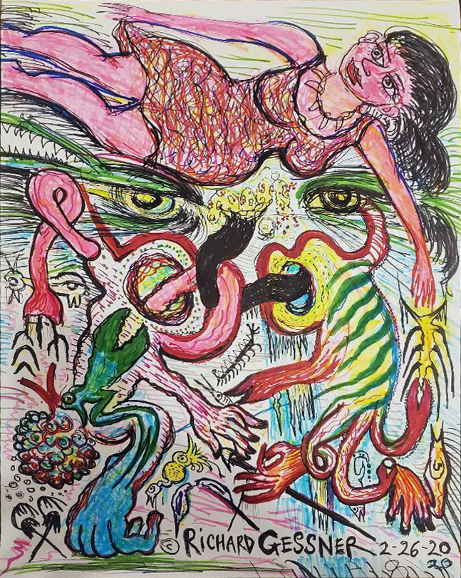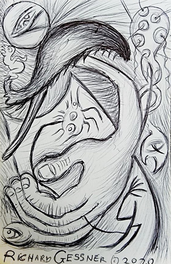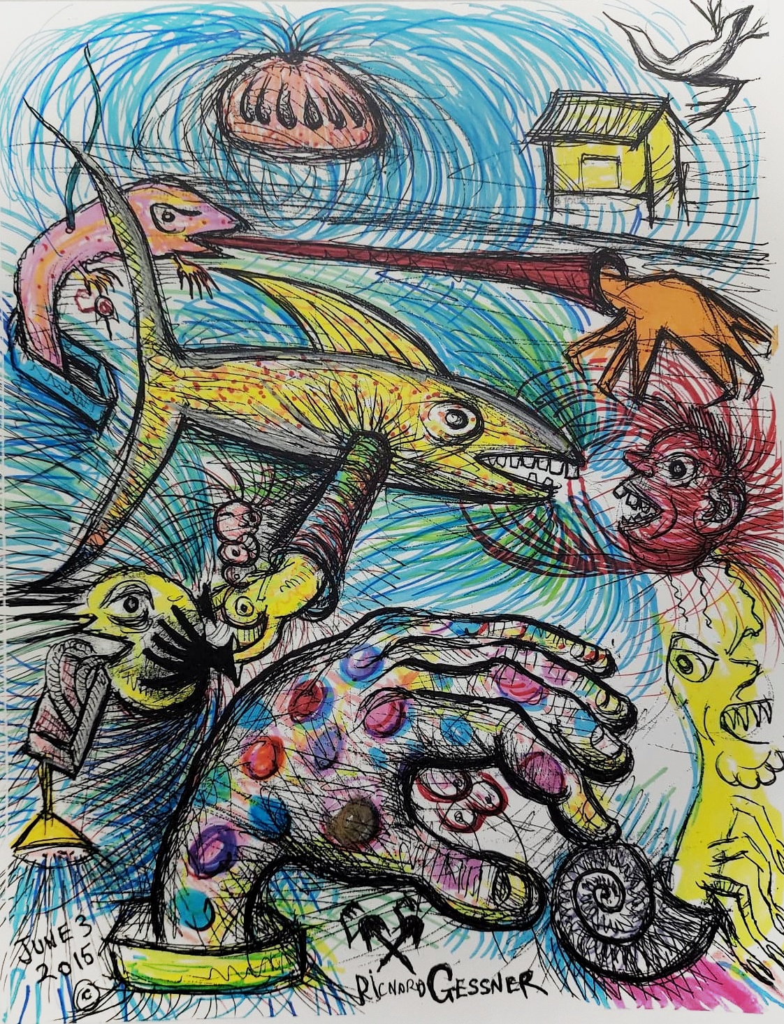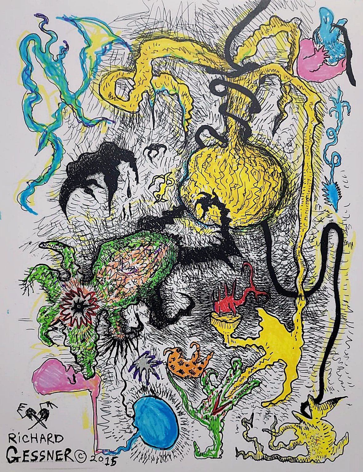 Richard Gessner’s fiction has been published in Air Fish: an anthology of speculative work, Rampike, Ice River, Coe Review, Another Chicago Magazine, Happy, The Act, Sein und Werden, Skidrow Penthouse, The Pannus Index, Fiction International and many other magazines. A collection, Excerpts from the Diary of a Neanderthal Dilettante & The Man in the Couch was published by Bomb Shelter Props. Gessner’s drawings and paintings have appeared in Raw Vision, Courier News, Asbury Park Press, Rampike, Skidrow Penthouse, and exhibited at Pleiades Gallery, Hamilton Street Gallery, Cry Baby Gallery, The Court Gallery and the Donald B. Palmer Museum. Richard wrote The Conduit and Other Visionary Tales of Morphing Whimsy. He lives in Montclair, New Jersey.