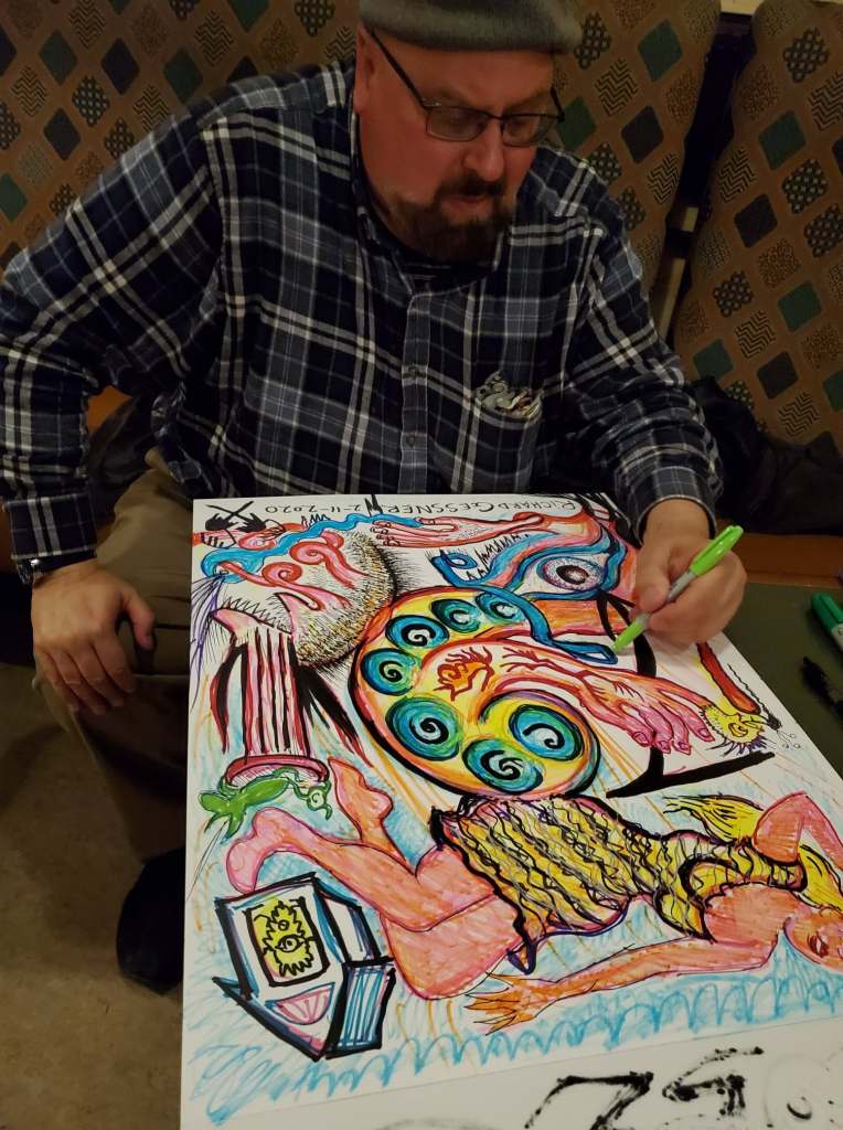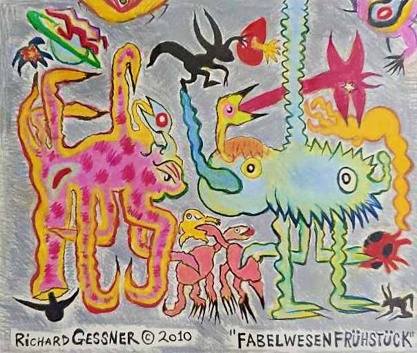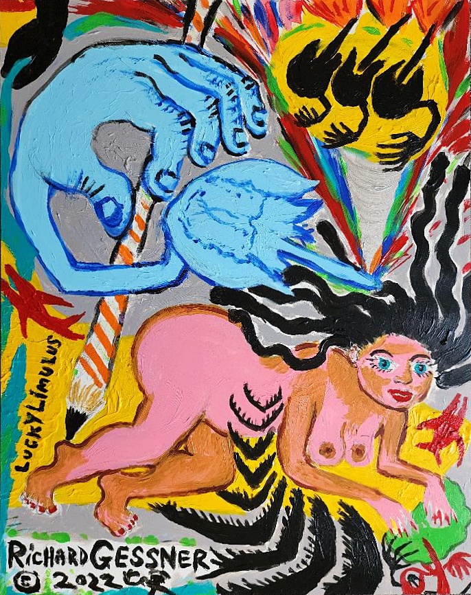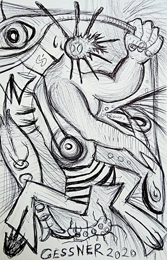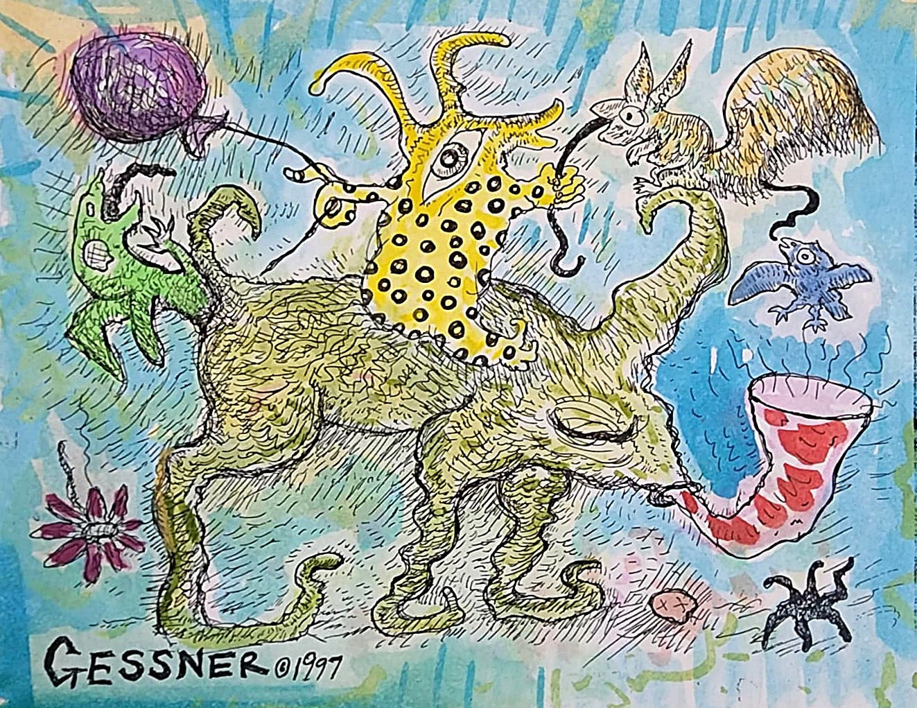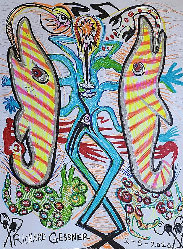 Richard Gessner’s fiction has been published in Air Fish: an anthology of speculative work, Rampike, Ice River, Coe Review, Another Chicago Magazine, Happy, The Act, Sein und Werden, Skidrow Penthouse, The Pannus Index, Fiction International and many other magazines. A collection, Excerpts from the Diary of a Neanderthal Dilettante & The Man in the Couch was published by Bomb Shelter Props. Gessner’s drawings and paintings have appeared in Raw Vision, Courier News, Asbury Park Press, Rampike, Skidrow Penthouse, and exhibited at Pleiades Gallery, Hamilton Street Gallery, Cry Baby Gallery, The Court Gallery and the Donald B. Palmer Museum. Richard wrote The Conduit and Other Visionary Tales of Morphing Whimsy. He lives in Montclair, New Jersey.