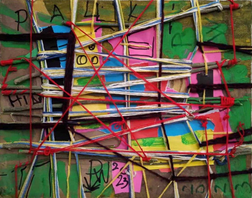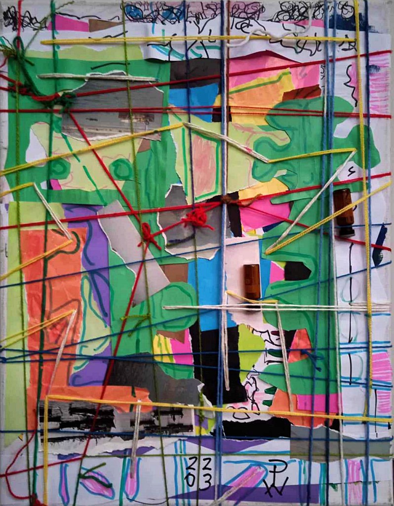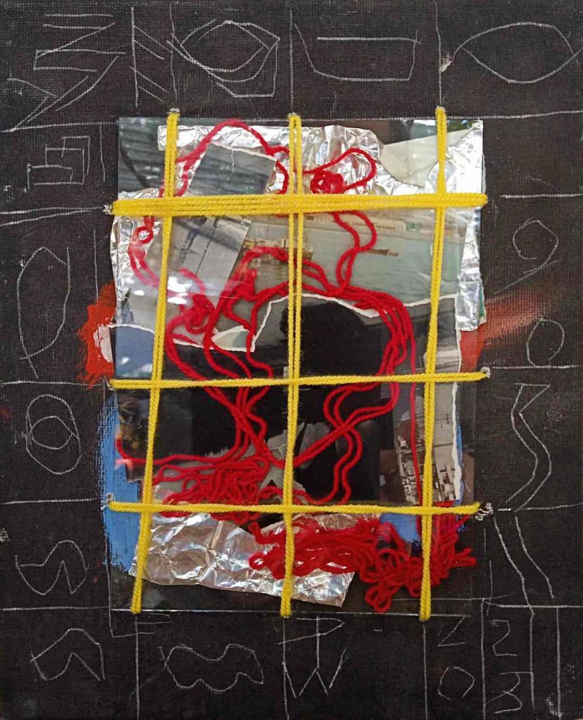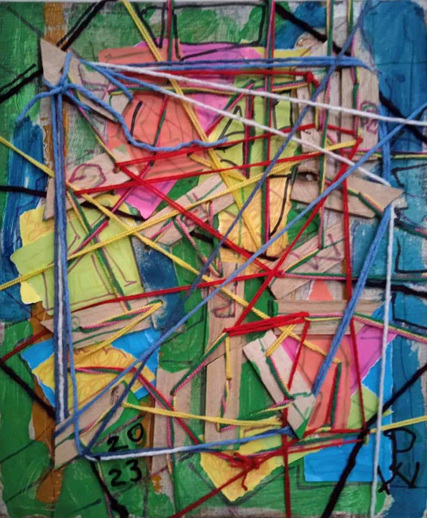 Color Los colores vienen con los objetos que encuentro. Uso común de temperas y acuarelas, cartones preparados con esmalte blanco al agua. El papel lustre aporta colores brillantes y planos, es ahí donde tempera y acuarela vienen a apaciguar estos planos, luego como complemento: Hilos, lanas y pitillas aportan lineas de colores inenarrables, son lineas de color que tensan con ángulos y triángulos las formas, por tanto lo que ya está pintado, y recortado se reaviva, los colores se superponen, se acercan el hilo negro con la tempera negra, el amarillo del hilo con el amarillo del papel lustre, la acuarela hace su magia transparente. Los géneros me aportan un color de sedas azules o sedas amaranto, todos los colores dependen del material en uso (y huso) y de esta convergencia surge el color final de la cosa. Obras que sólo tienen el color de los papeles lustres lustrosos satinados, con recortes se forman las manchas, se forman las zonas de color y todas sus líneas, más el color de las lanas que uso para atrapar el papel, es indiscriminada mi elección de los colores, los hago entrar en cada una de las obras, esto hace que se asemejen mucho entre ellas, o tal vez sólo es familiaridad, color familiar.